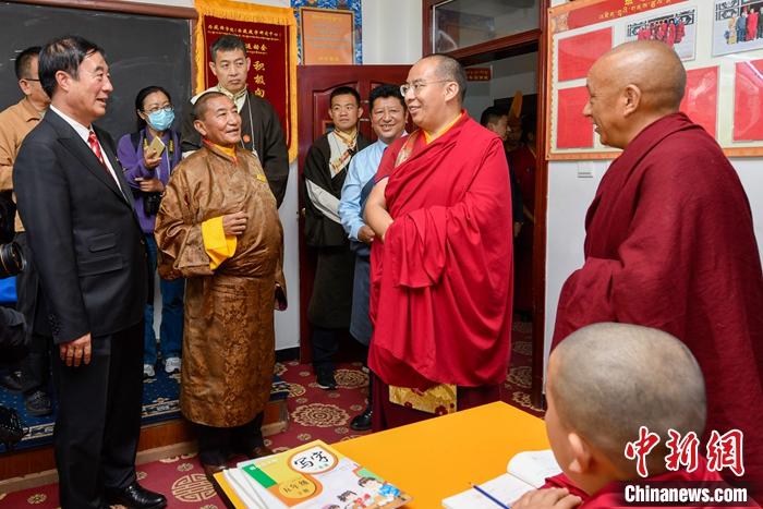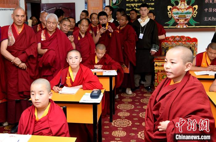 6月16日,班禪來到西藏佛學院少年活佛班,了解少年活佛們的學習、生活情況。中新社發(fā) 李林 攝
