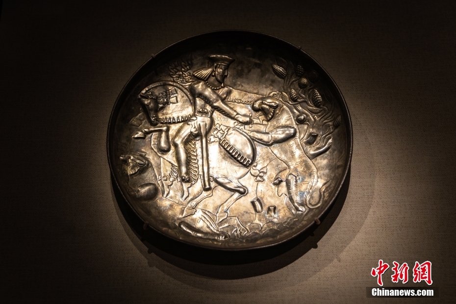 8月18日,甘肅省敦煌市,“燦爛記憶:從美索不達米亞到犍陀羅——東方文明古國冶金術展”在敦煌莫高窟揭幕。此次展覽是敦煌研究院與日本平山郁夫絲綢之路美術館近年第三次合作,展覽共展出從地中海沿岸,到中亞絲綢之路沿線國家的金屬類文物221組件、絲路錢幣33枚,時間跨度長達4000多年、范圍遍及歐亞大陸的絲綢之路上各大文明區(qū)域冶金術的變化圖景。圖為參展展品帝王狩獵紋盤。 中新社發(fā) 王嘉奇 攝