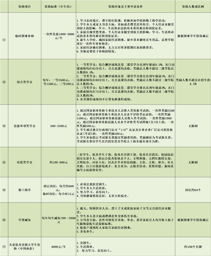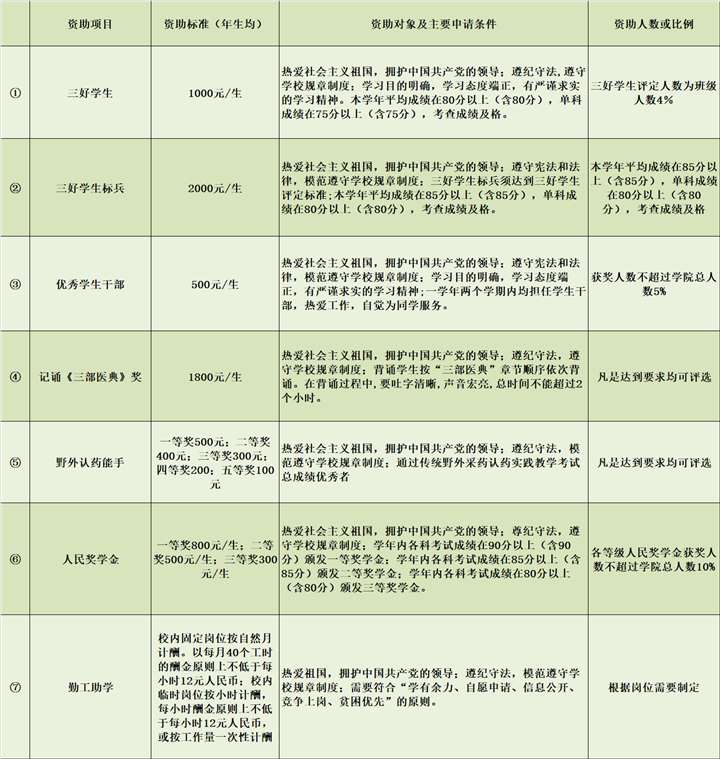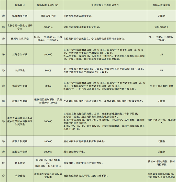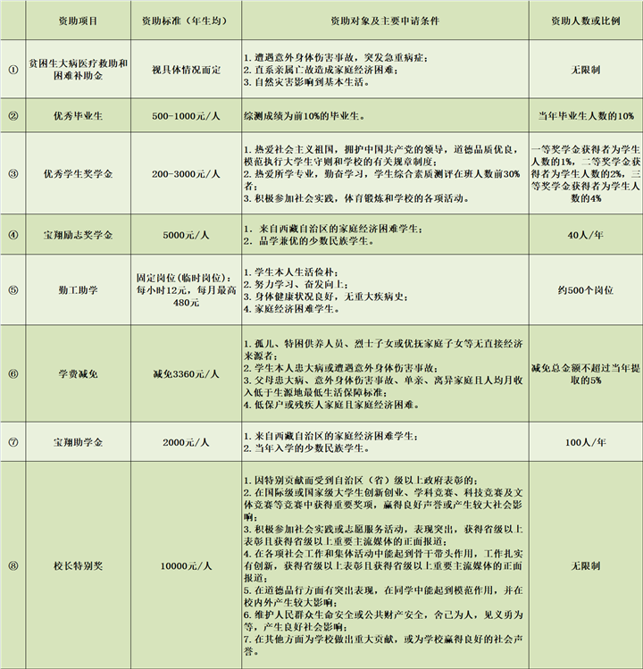 這些資助項(xiàng)目包括國(guó)家政策、西藏自治區(qū)政策和西藏各高校的政策,全部列出了明確的申請(qǐng)條件,涵蓋了學(xué)生生活、學(xué)習(xí)的方方面面。其中,有的項(xiàng)目針對(duì)家庭經(jīng)濟(jì)困難的學(xué)生給予學(xué)費(fèi)、住宿費(fèi)等的減免;有的項(xiàng)目為學(xué)生提供各種校內(nèi)勤工助學(xué)機(jī)會(huì),讓學(xué)生通過勞動(dòng)獲得報(bào)酬;有的項(xiàng)目獎(jiǎng)勵(lì)入伍,有的項(xiàng)目獎(jiǎng)勵(lì)發(fā)明創(chuàng)造……并且,西藏各高校在制定資助政策時(shí)體現(xiàn)出了各學(xué)校鮮明的辦學(xué)特點(diǎn)。例如,西藏藏醫(yī)藥大學(xué)設(shè)置了面向所有學(xué)生的“記誦《三部醫(yī)典》獎(jiǎng)”,要求“熱愛社會(huì)主義祖國(guó),擁護(hù)中國(guó)共產(chǎn)黨的領(lǐng)導(dǎo);遵紀(jì)守法,遵守學(xué)校規(guī)章制度;背誦學(xué)生按‘三部醫(yī)典’章節(jié)順序依次背誦。在背誦過程中,要吐字清晰,聲音宏亮,總時(shí)間不能超過2個(gè)小時(shí)。”凡是達(dá)到要求的學(xué)生,獎(jiǎng)勵(lì)1800元。