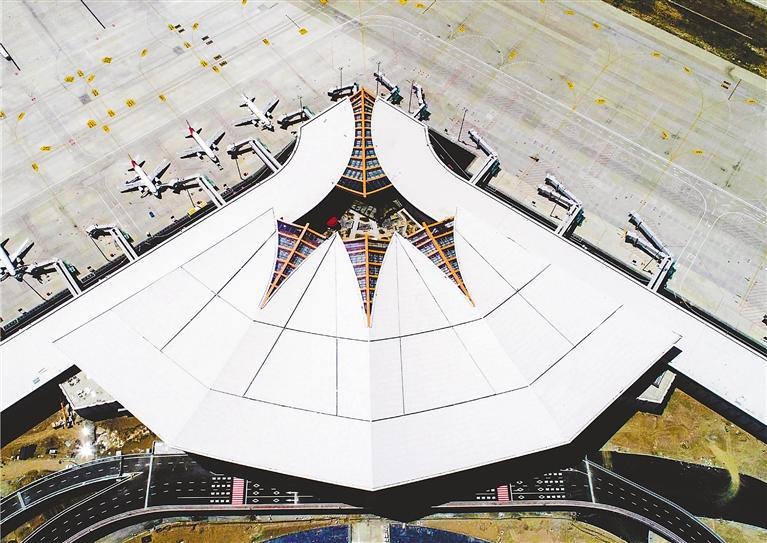 基礎(chǔ)設(shè)施更加完善,西藏民航航線擴(kuò)展到152條,通航城市發(fā)展到68個(gè),進(jìn)出港航班日均219架次,2021年旅客吞吐量達(dá)603萬余人次。圖為西藏自治區(qū)拉薩市貢嘎國(guó)際機(jī)場(chǎng)T3航站樓一角。