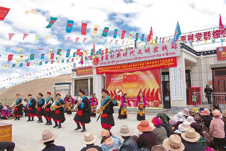 2021年7月2日,西藏自治區(qū)薩迦縣多夏村村民在新時(shí)代文明實(shí)踐站參加慶祝中國(guó)共產(chǎn)黨成立100周年和西藏和平解放70周年活動(dòng)。