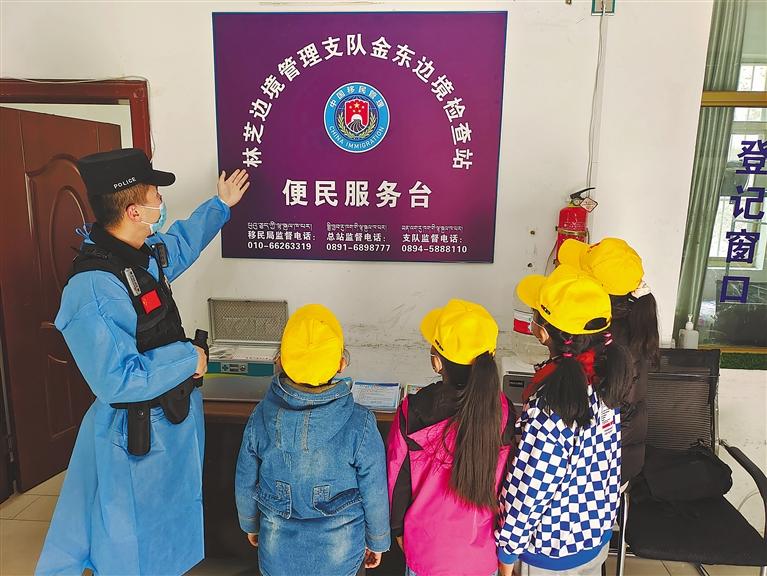 圖為金東邊境檢查站民警為學生介紹便民服務臺用途。記者 張猛 通訊員 揚子 攝