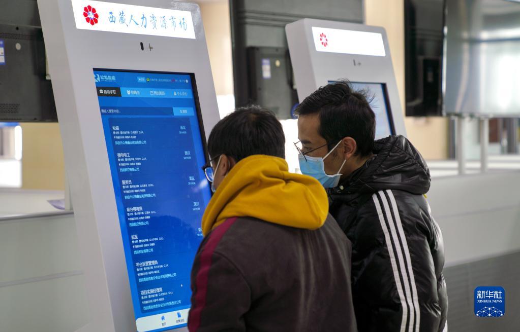 2月8日,求職者在西藏2023年“春風(fēng)行動”暨就業(yè)援助月招聘活動現(xiàn)場尋找崗位。新華社發(fā)(旦增努布攝)