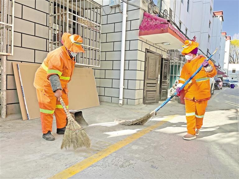 薩市城關區(qū)女環(huán)衛(wèi)工人在清掃地面。記者 旦增蘭澤 攝