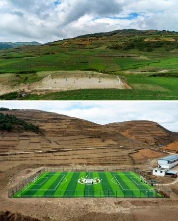 上圖:2019年5月26日,孩子們?cè)谕呶嵝W(xué)的泥地足球場(chǎng)上訓(xùn)練。下圖:3月3日,瓦吾小學(xué)的女足隊(duì)員們?cè)凇懊倒鍓?mèng)想球場(chǎng)”上訓(xùn)練。新華社記者沈伯韓攝