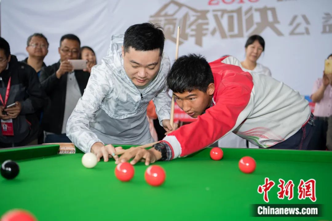 2018“瑞德”斯諾克“巔峰對(duì)決”公益活動(dòng)在西藏啟幕,丁俊暉指導(dǎo)藏族學(xué)生打臺(tái)球。何蓬磊 攝