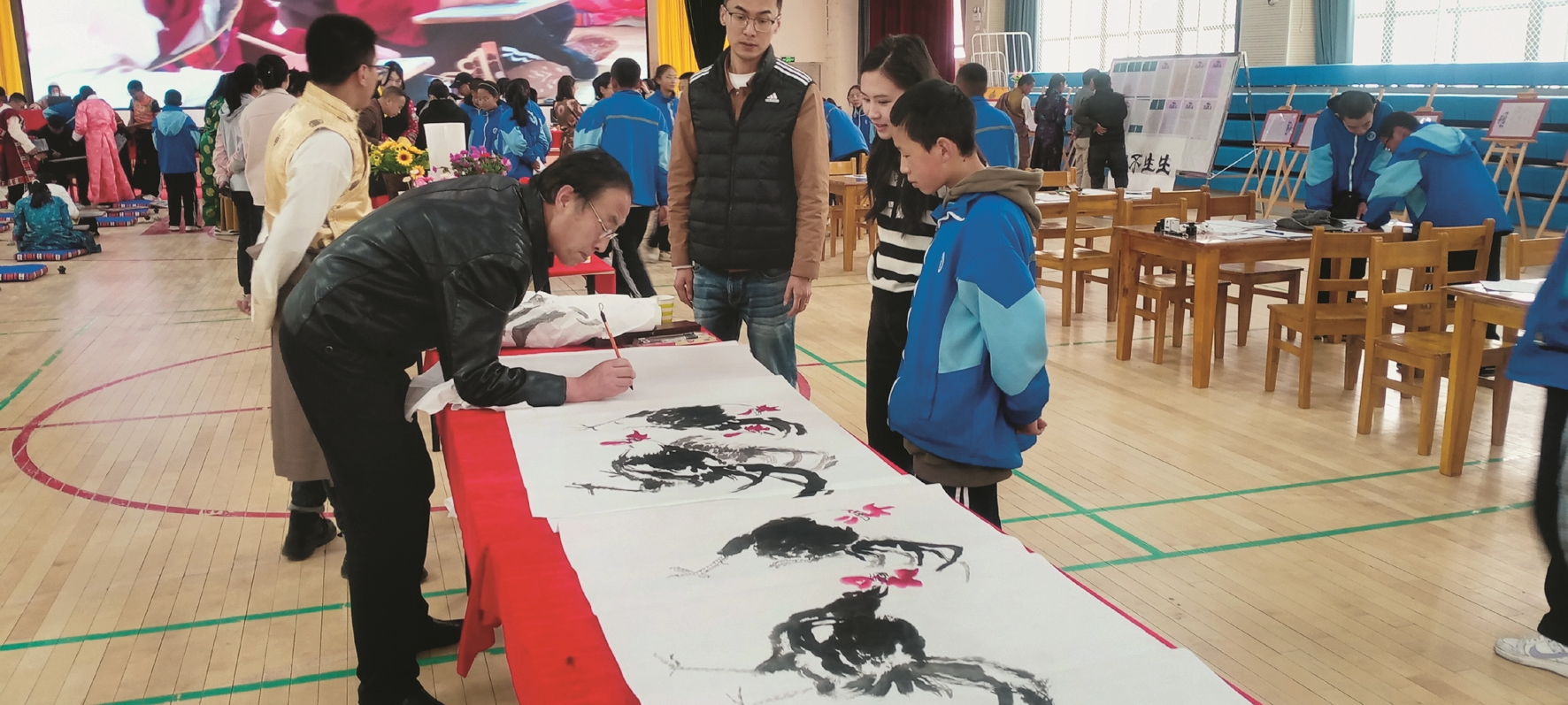 活動(dòng)為拉薩市柳梧初級(jí)中學(xué)愛好書法的師生提供了一個(gè)展現(xiàn)自我價(jià)值的平臺(tái),為充分展現(xiàn)中國書畫藝術(shù)魅力、繼承和弘揚(yáng)傳統(tǒng)的國粹文化藝術(shù),藝術(shù)家們揮毫潑墨,現(xiàn)場(chǎng)演繹國畫和書法經(jīng)典,以提升廣大師生的藝術(shù)修養(yǎng)和審美情趣,激發(fā)大家研學(xué)書法的興趣和愛好。