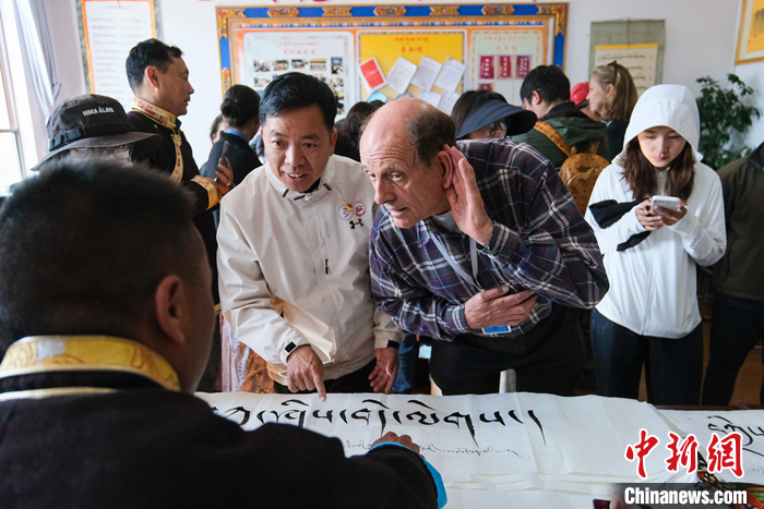 圖為5月18日上午,參訪團成員柯馬凱(Michael Crook)側(cè)耳傾聽藏文書法老師的講解。 中新社記者 江飛波 攝