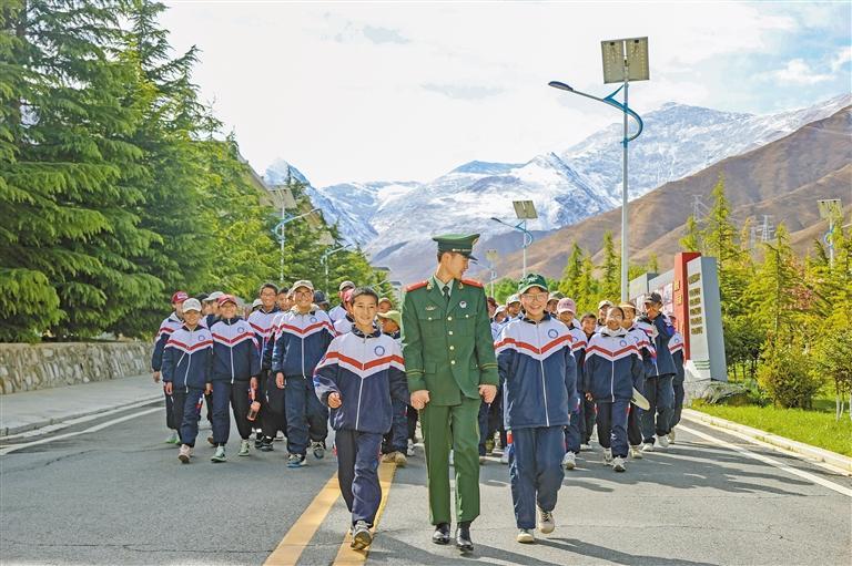 武警官兵帶領(lǐng)學(xué)生參觀營(yíng)區(qū)。索朗旺堆 記者 旦增蘭澤 攝