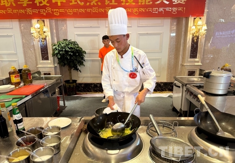 圖為來自昌都市職業(yè)技術(shù)學(xué)校的參賽選手旦增羅布在炒菜攝影:旦曲