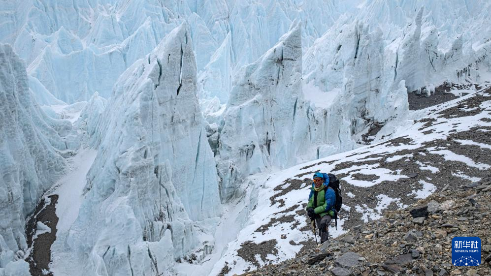 圖為高山向?qū)Т稳首哌^珠峰東絨布冰川。新華社記者 晉美多吉 攝