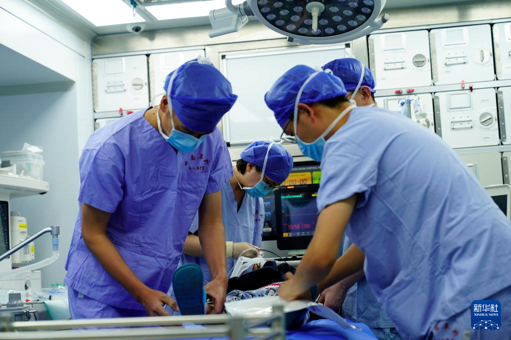醫(yī)護人員在移動介入治療手術(shù)車上為先心病患兒進行微創(chuàng)手術(shù)。新華社記者 劉洪明 攝