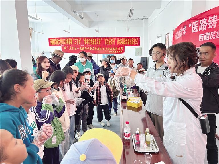 出征儀式上,大學(xué)生理論宣講團(tuán)成員以黨的二十大報告為切入點,結(jié)合在成長過程中所學(xué)、所見、所聞,向社區(qū)干部和居民宣講。東南大學(xué)副教授廖望為居民宣講合理膳食醫(yī)學(xué)知識。中山大學(xué)醫(yī)學(xué)院教授楊中漢用通俗易懂的語言,詳細(xì)講述了急救技能、自救措施,并用假人模型進(jìn)行現(xiàn)場展示,贏得了大家的陣陣掌聲。文藝宣傳隊成員為社區(qū)居民帶去了豐富多彩的文藝演出,演出以歌舞為主,傳統(tǒng)鍋莊、熱巴舞、芒康弦子舞、新疆舞、街舞等舞蹈精彩紛呈,歌曲以獨唱合唱形式,圍繞禮贊中國共產(chǎn)黨,禮贊新時代、新西藏等主題,豐富了社區(qū)群眾的精神文化生活。