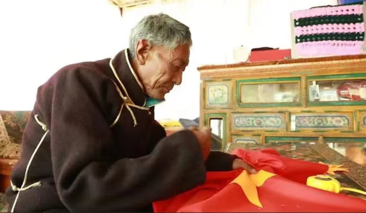 圖為措美縣卓德村堅持50年手縫國旗的頓久老人。(受訪者供圖)