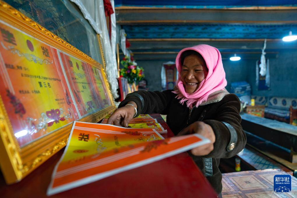 斯曲卓瑪?shù)膵寢屧谡砗⒆觽兊莫?jiǎng)狀(11月9日攝)。新華社發(fā)(丁增尼達(dá) 攝)