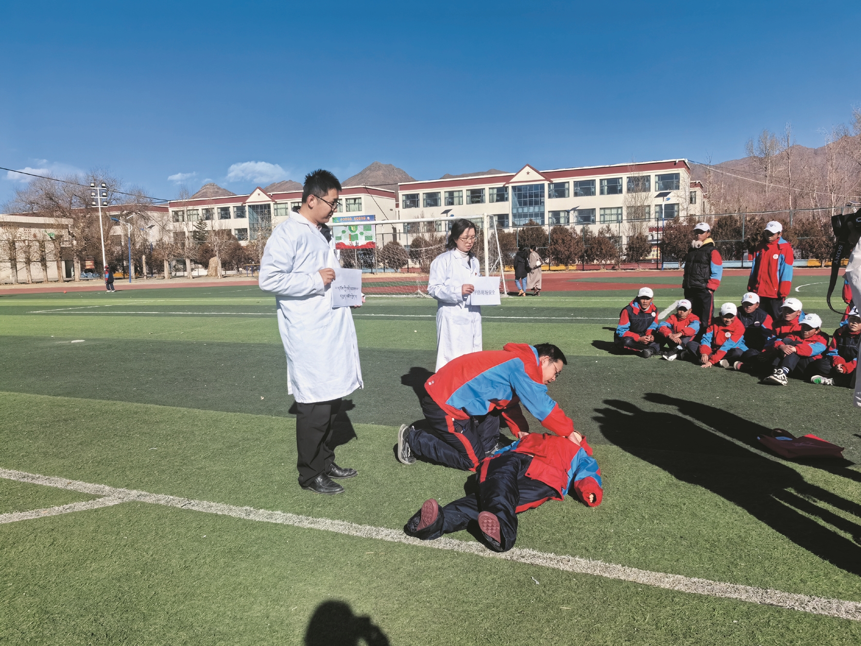 圖為援藏專家給學生們演示心肺復蘇操作過程。拉薩融媒記者 次仁卓嘎攝