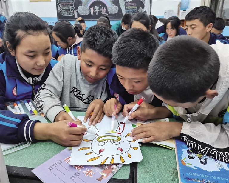 “通過拉巴卓瑪?shù)倪@幅畫,我了解到她是一個(gè)很有想法的孩子,她很清楚自己想要什么。課程剛開始時(shí),我觀察到她一個(gè)人坐在角落里,低著頭,也不怎么和旁邊同學(xué)說話,但是通過這個(gè)課程的開展,她會(huì)在課后主動(dòng)跑來和我說她近期遇到的困惑,我感覺到她正逐漸敞開心扉,這與我們當(dāng)初開設(shè)這個(gè)課程的初心是一樣的。我們就是希望可以通過這些課程,讓當(dāng)?shù)氐膶W(xué)生在心理方面得到更多的開導(dǎo)、正視自己的情緒,并從中去獲得一些能量,所以現(xiàn)在看到她的變化,我很高興。”王婕婷說。