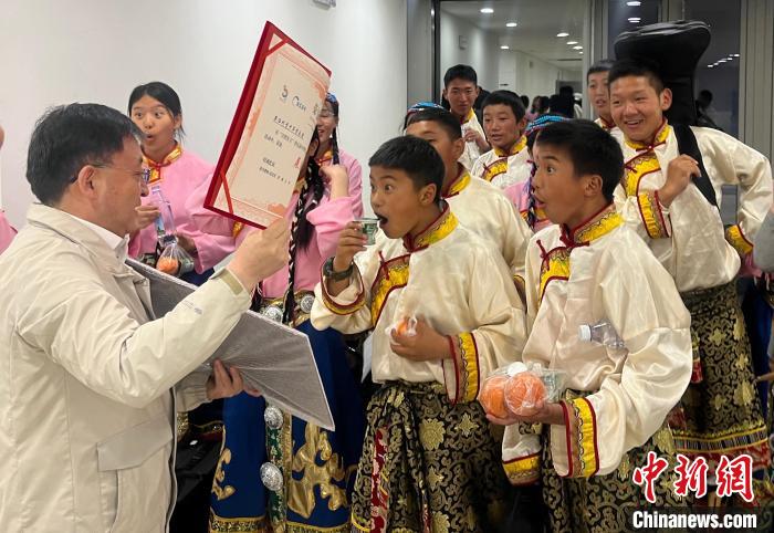 圖為果洛州青少年管樂團(tuán)的成員們領(lǐng)取獲獎證書?!暵?攝