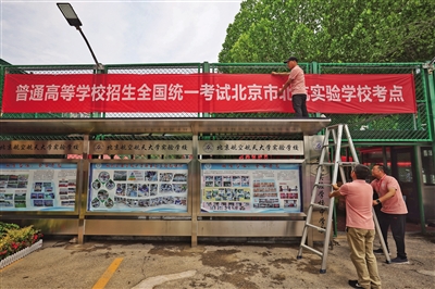 6月6日,記者在北京航空航天大學實驗學校中學部(簡稱“北航實驗學校”)考點看到,學校西門處已懸掛起高考考點橫幅、考場布置已就位,校園內放置了多個溫馨的提示語標牌。據悉,該校是今年新增高考考點之一,承接來自9所學校277名考生的高考組考任務。此外,記者還探訪了北京高考人大附中經開學校考點