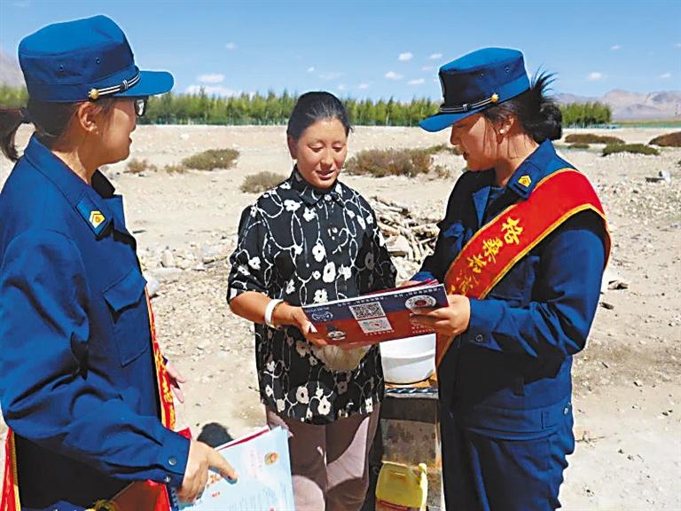 圖為阿里地區(qū)“雪域藍(lán)盾·消防宣傳教育講師團(tuán)”成員深入轄區(qū)為農(nóng)牧民群眾講解消防安全知識。