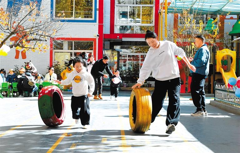 圖為孩子和家長(zhǎng)比賽滾輪胎。記者 王敏 攝
