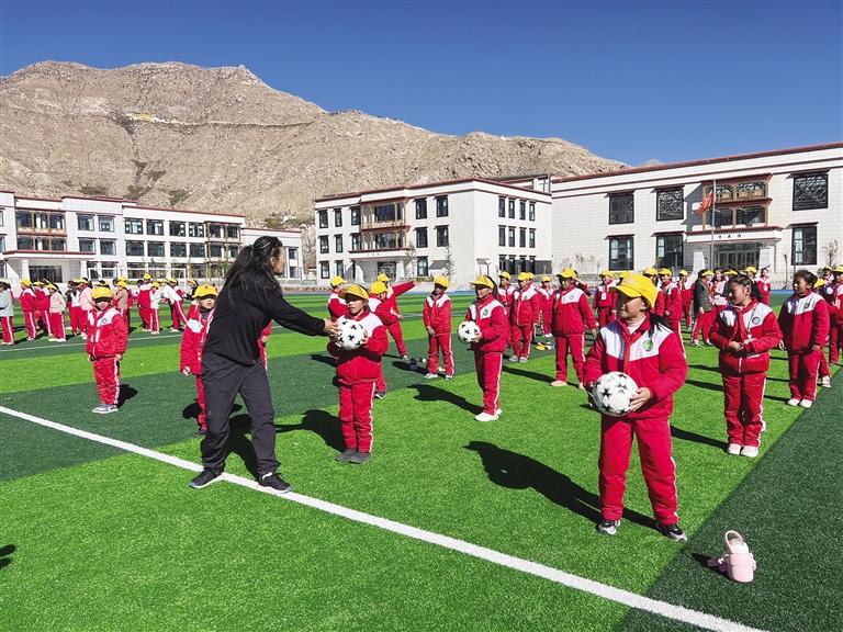 捐贈儀式結(jié)束后,全國女子自由式摔跤冠軍尼瑪拉姆和國家級摔跤裁判員索朗德吉帶領學生們進行了體育活動,學生們興奮地試用著新器材,享受體育運動帶來的快樂。