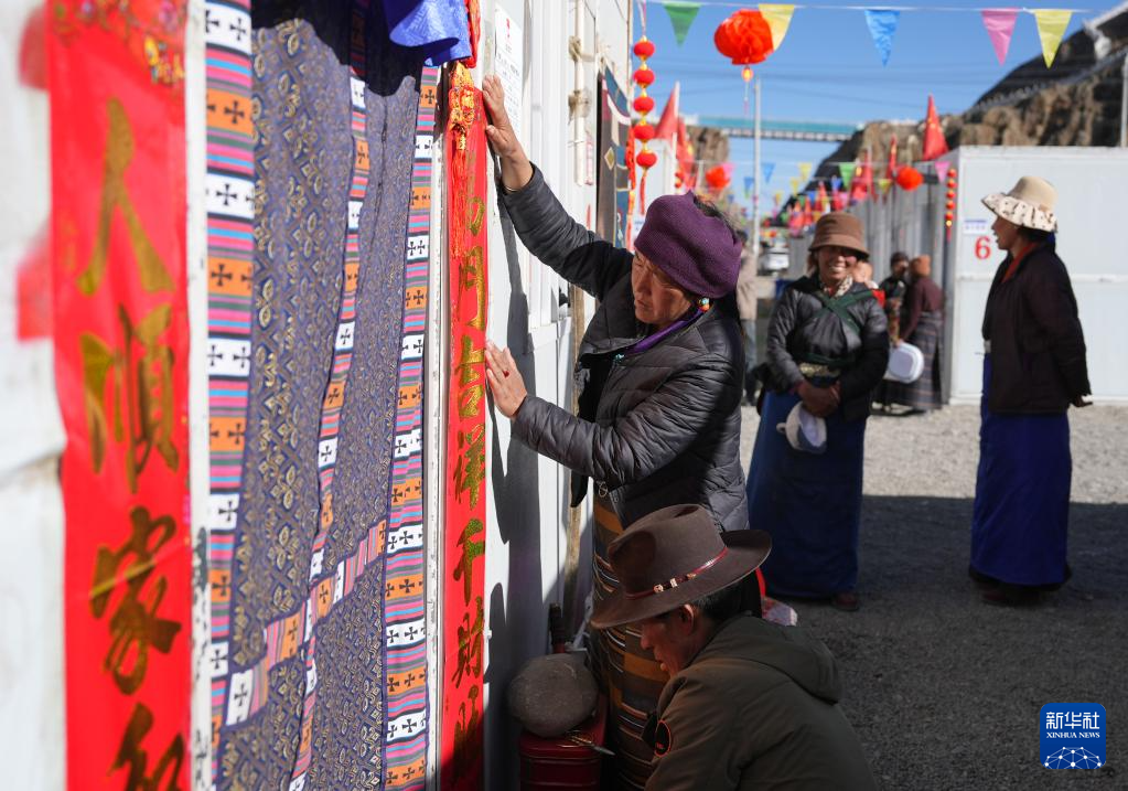 1月26日,拉孜縣吉如村安置點群眾在張貼春聯(lián)。新華社記者 晉美多吉 攝
