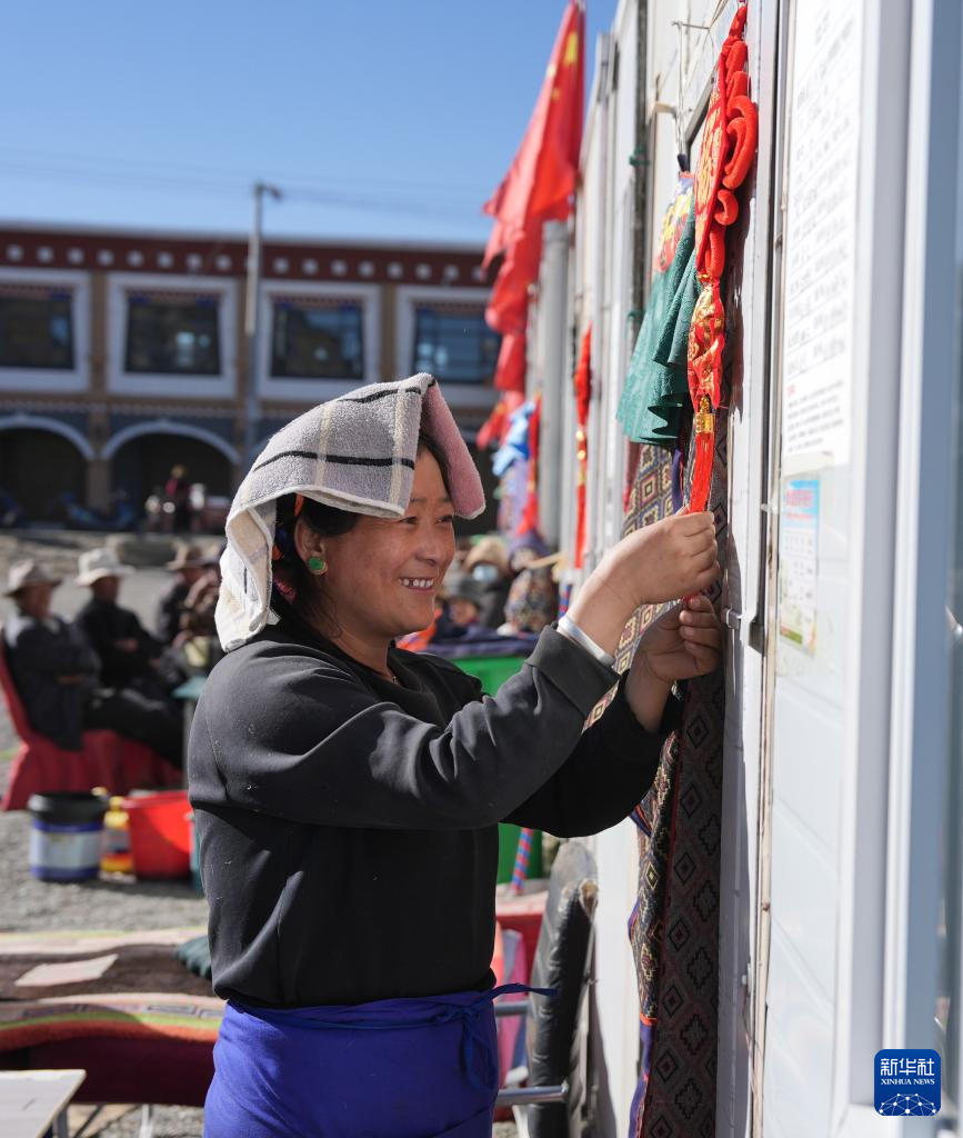 1月26日,拉孜縣吉如村安置點群眾在掛吉祥結(jié)。新華社記者 晉美多吉 攝