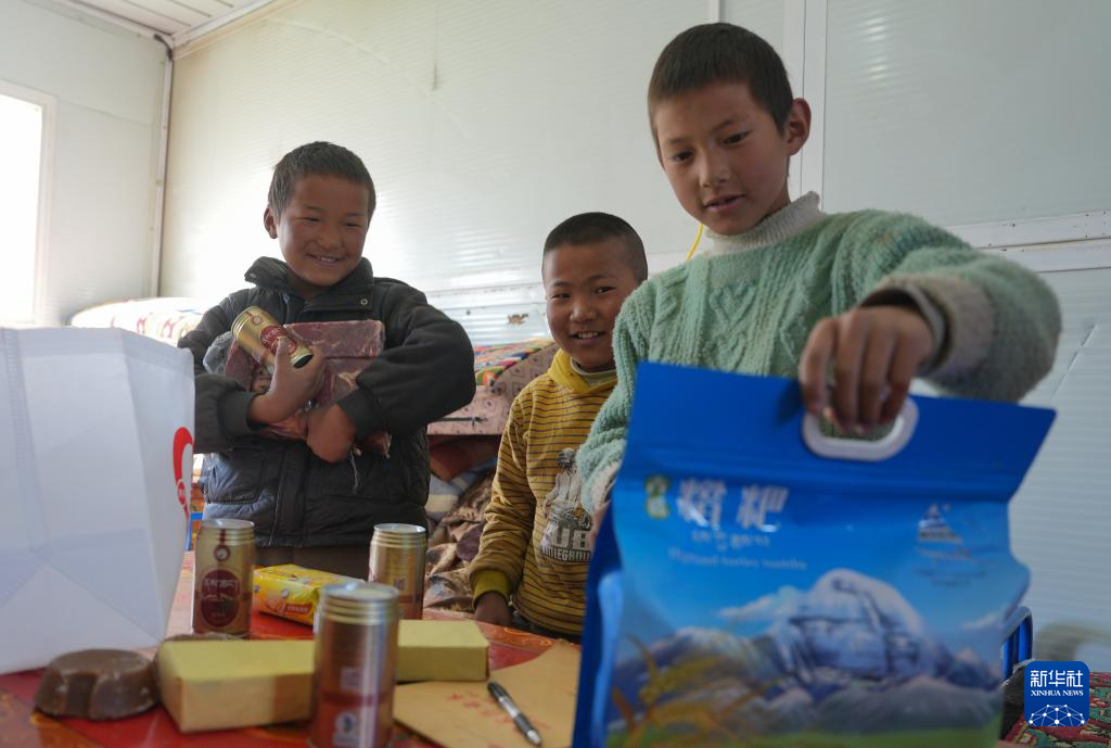 1月27日,拉孜縣加嘎村安置點受災(zāi)群眾領(lǐng)到新年大禮包。新華社記者 晉美多吉 攝