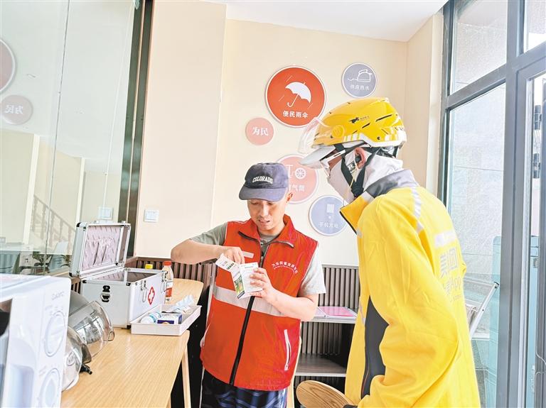 圖為社區(qū)工作人員在驛站為外賣員免費(fèi)提供藥品。記者 武沛濤 攝