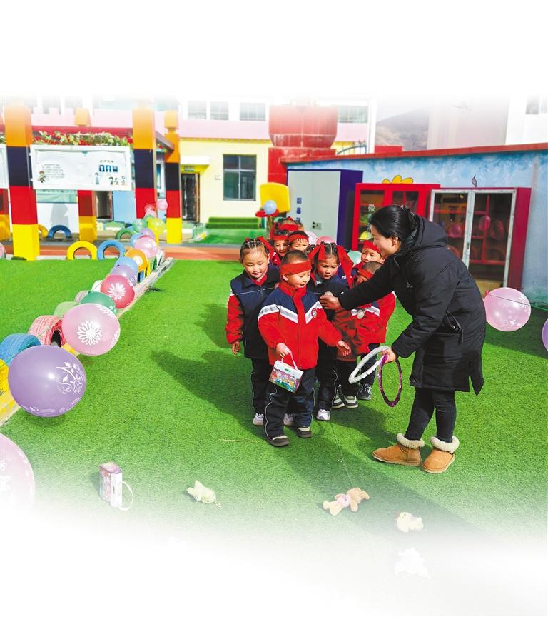 新學期開學當日,林周縣幼兒園老師組織幼兒做游戲。文/圖 記者 央金