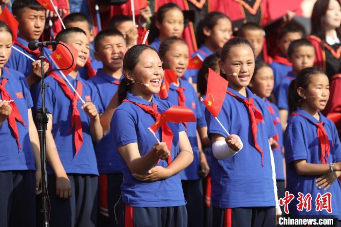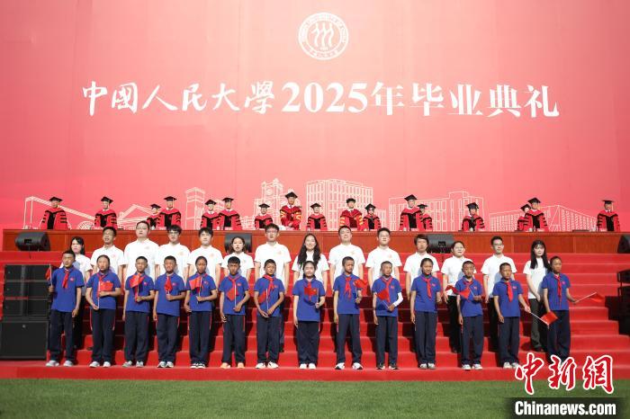 6月23日,中國(guó)人民大學(xué)2025年畢業(yè)典禮現(xiàn)場(chǎng),措果鄉(xiāng)中心小學(xué)的孩子們與人大畢業(yè)生們小手牽大手,相伴而立,共同唱響《萬(wàn)疆》。主辦方供圖