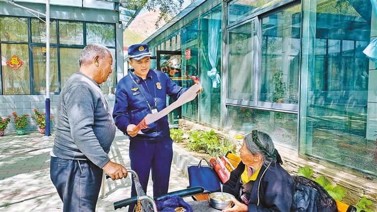昂仁縣消防救援大隊消防宣傳員聯(lián)合民政部門走進轄區(qū)集中供養(yǎng)服務中心排查消防安全隱患。