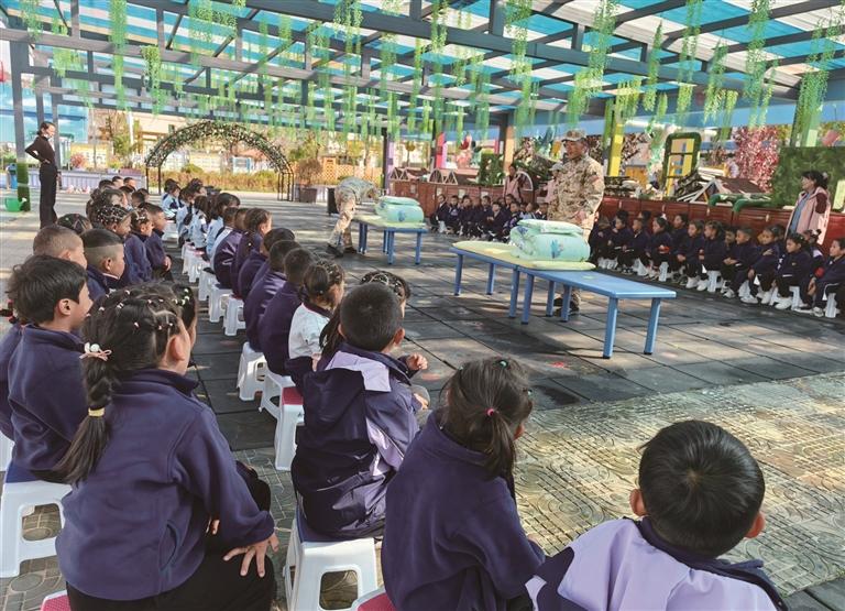 圖為退役軍人為孩子們進(jìn)行國(guó)防宣講。