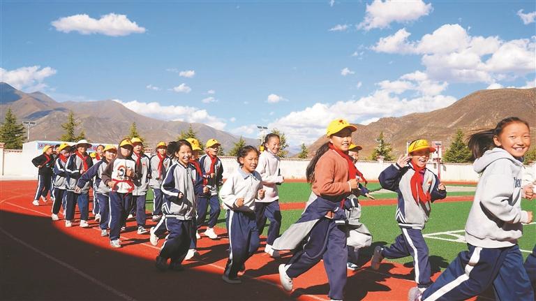 圖為拉薩市墨竹工卡縣南京實(shí)驗(yàn)小學(xué)四年級(jí)學(xué)生開展大課間體育活動(dòng)。記者 格桑倫珠 攝