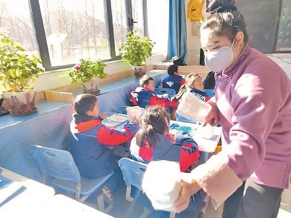 圖為工作人員為學生發(fā)放宣傳手冊、學習用品等。記者 央金 攝