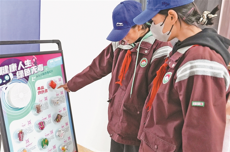 學(xué)生們共同交流探討如何辨別偽裝成日常零食的新型毒品包裝。記者 格桑倫珠 攝
