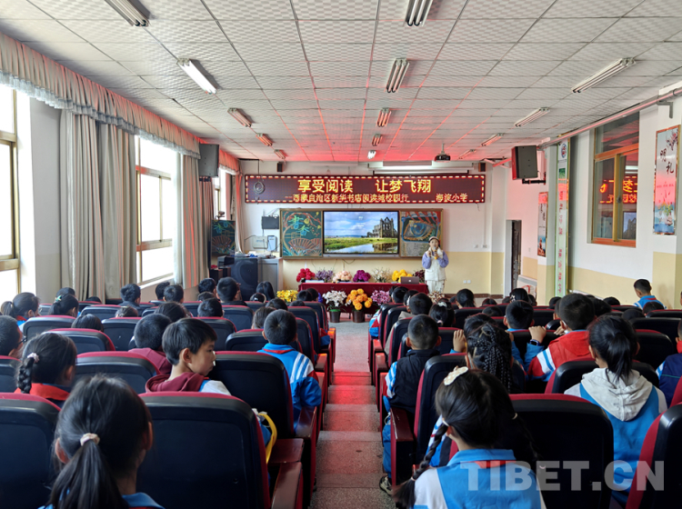 圖為4月23日,西藏自治區(qū)新華書店在拉薩市城關(guān)區(qū)海淀小學(xué)開展的“享受閱讀讓夢飛翔”閱讀校園行活動現(xiàn)場?;顒友埩俗骷依钗粝?qū)W生們分享人與動物、人與自然的故事 攝影:次旦拉姆