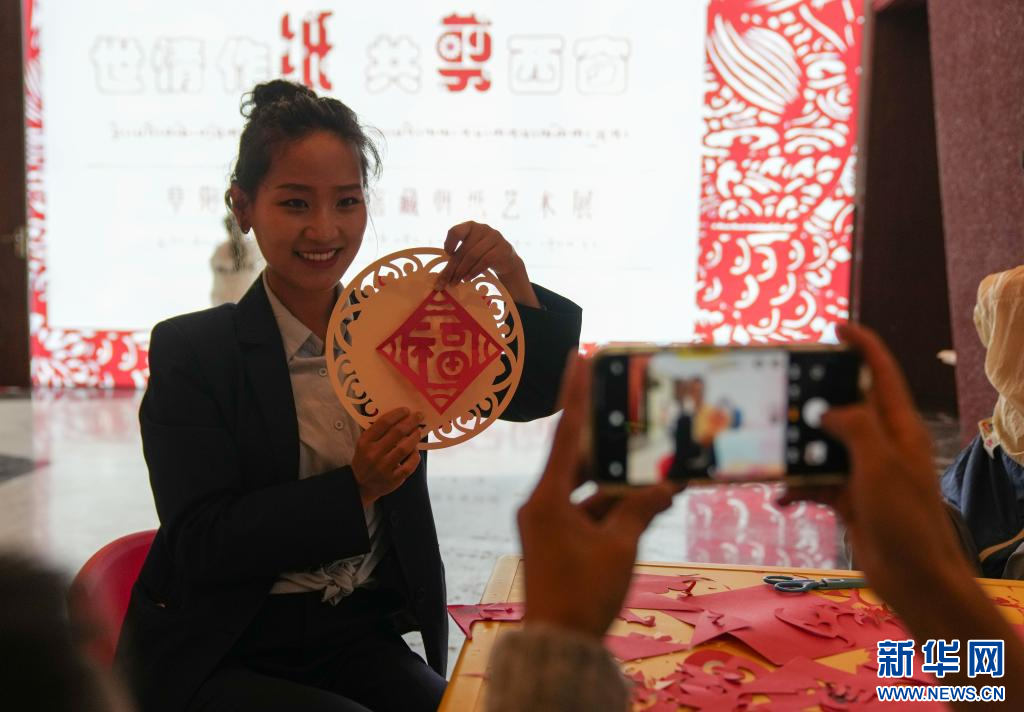 7月24日,活動現(xiàn)場上,一名參與者在展示剛完成的剪紙作品。