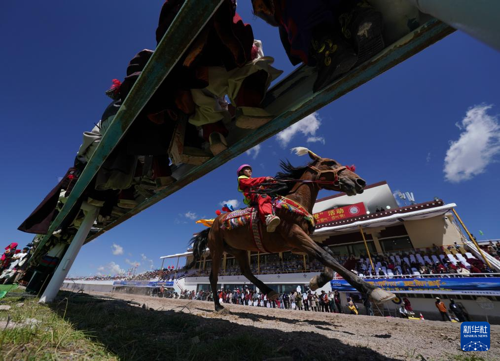 8月10日,觀眾坐在圍欄上觀看賽馬。新華社記者 晉美多吉 攝