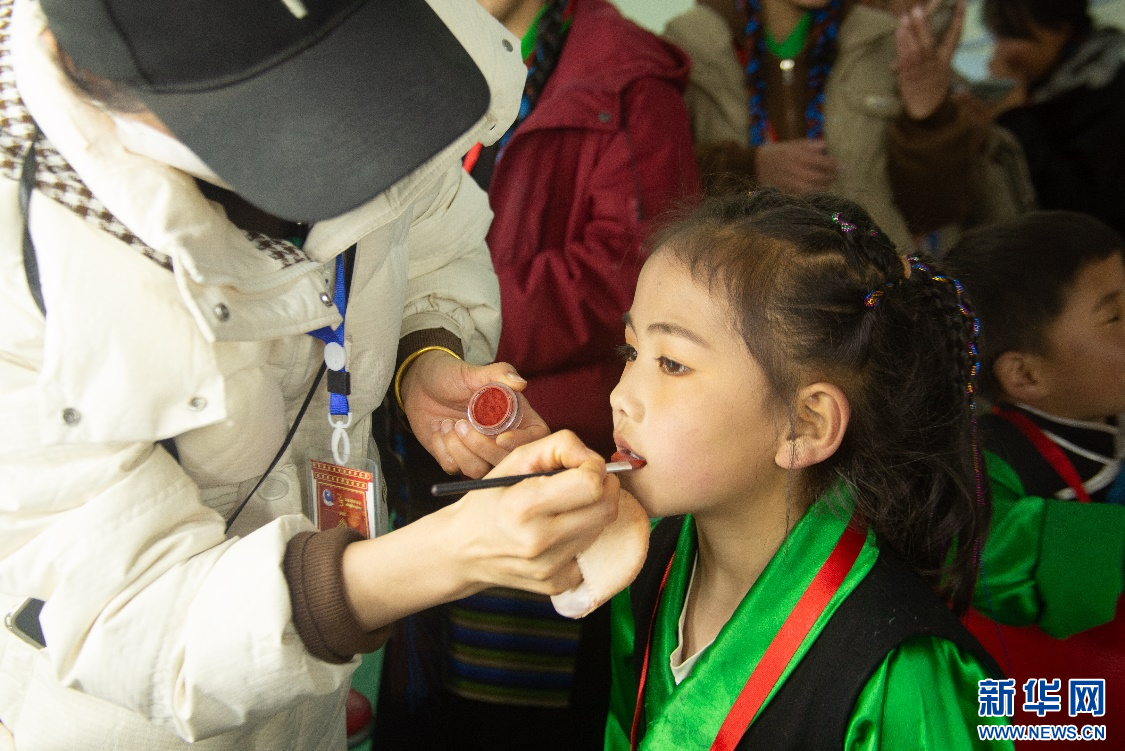 演員次旺拉姆在后臺(tái)補(bǔ)妝(2月14日攝)。新華網(wǎng)發(fā) 達(dá)瓦拉姆 攝