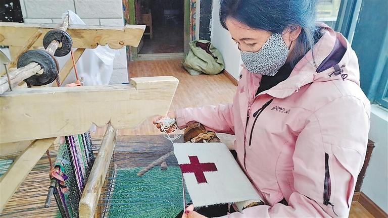 在這里,一場編織技能培訓正在進行,婦女們的雙手在織線之間來回游走穿梭,正專注地編織著藏式包、卡墊等各種手工藝品。
