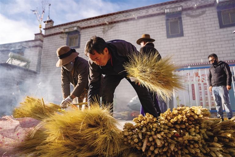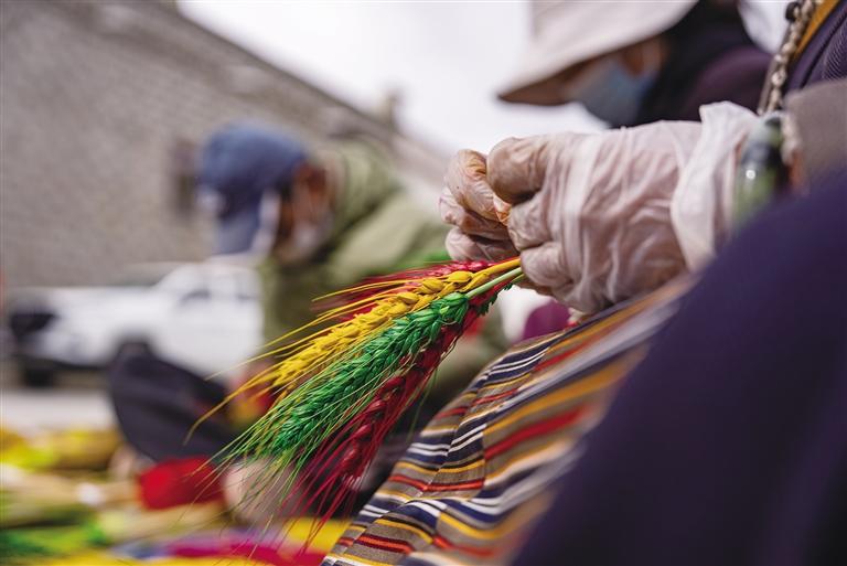 每年12月起,桑木村處處可見“羅薩梅朵”。清晨,天還未亮,村民們就已忙碌起來。有人將制作好的“羅薩梅朵”打包送往拉薩市區(qū)售賣,有人則繼續(xù)為剩下的麥穗和青稞穗上色、曬干。“我從小看著長輩們制作‘羅薩梅朵’,7歲就開始幫忙捆綁,20歲開始獨立制作。每到這個時候,我就知道新年快到了?!?4歲的村民卓瑪次仁回憶道。