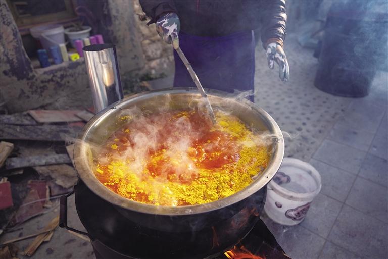 “玫紅色和黃色的都做完了吧?這個顏料水我倒了,開始準備制作青色?!币慌?,61歲的央金將盆洗干凈,繼續(xù)煮水放入顏料?!啊_薩梅朵’有青色、綠色、玫紅色、黃色四種顏色,其中青色耗時最長,不僅需要自己調(diào)制,而且最難上色?!毖虢鹫f,“我們一般是早上7點開始上色,上完色都快下午4點了。”