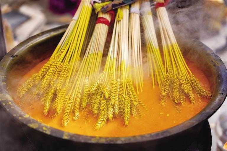 從春耕、夏耘、秋收到冬天的染色、晾干、捆綁、售賣,“羅薩梅朵”的制作過程并不簡單,種植和上色都極其辛苦。卓瑪次仁告訴記者:“每年4月,我們開始種植小麥和青稞,澆水施肥。9月收割時,我們會挑選顆粒飽滿的麥穗和青稞穗,捆綁后去皮曬干。10月,將它們收入屋中,一層層壘起來,房間最好朝陽且沒有老鼠。11月,開始采購顏料和捆扎用的毛線?!?/p>