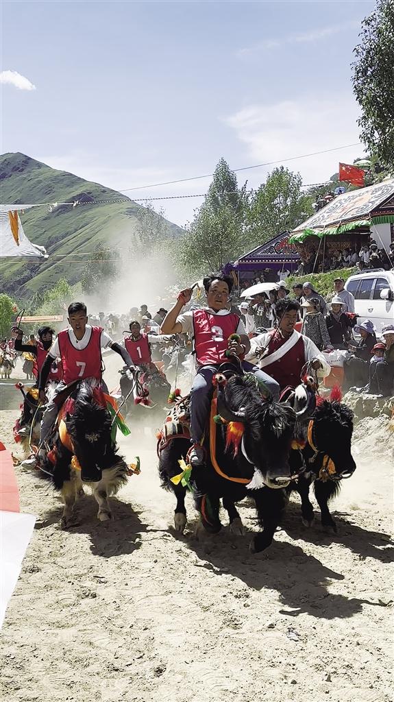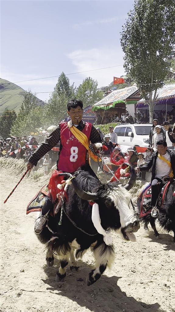 隨后登場(chǎng)的賽牦牛更是將氣氛推向高潮。這些被精心裝扮的牦牛,頭戴彩飾,頸掛銅鈴,在主人的駕馭下邁著既穩(wěn)健又不失迅猛的步伐沖向終點(diǎn)。與賽馬的靈動(dòng)不同,賽牦牛更顯沉穩(wěn)有力,銅鈴聲與觀眾的吶喊聲交織在一起,充滿了濃郁的鄉(xiāng)土氣息。參賽選手次仁笑著說:“這頭牦牛我養(yǎng)了五年,每年就等這一天證明它的實(shí)力!”