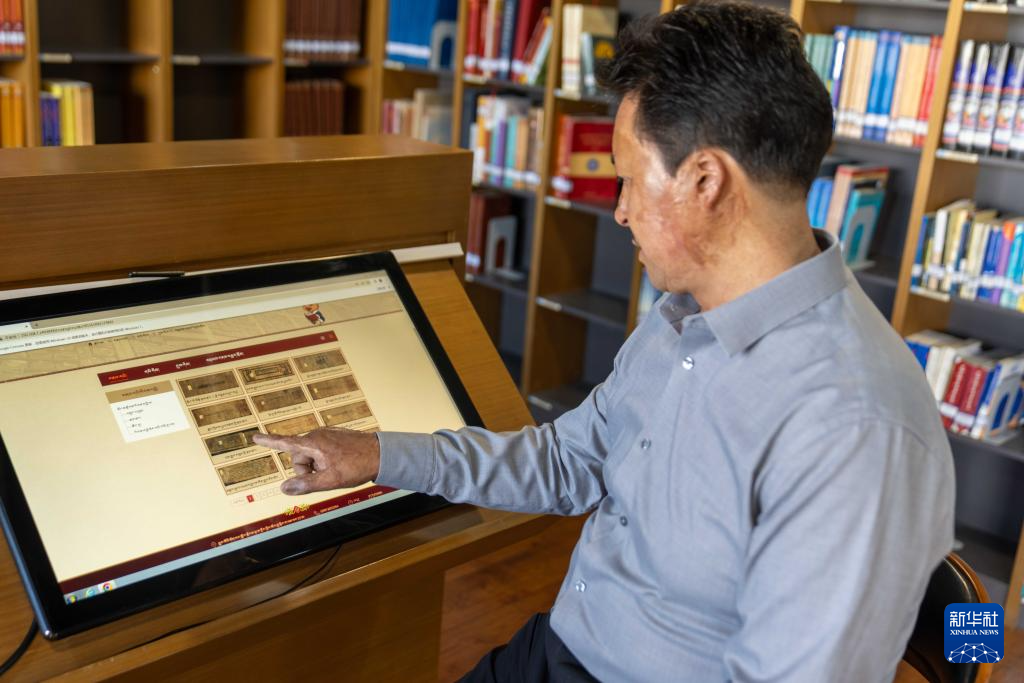 8月13日,西藏自治區(qū)圖書(shū)館副館長(zhǎng)邊巴次仁在介紹數(shù)據(jù)庫(kù)中的藏文古籍。新華社記者 旦增尼瑪曲珠 攝 ??