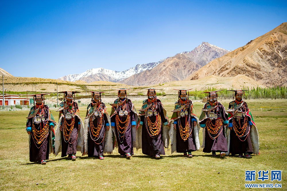 身著“普蘭服飾”的普蘭縣科迦村村民(6月10日攝)?!捌仗m服飾”,主要由袍子、披風(fēng)、頭飾、項(xiàng)鏈、腰帶、耳墜、靴子組成。其中最精美、最獨(dú)特的為婦女服飾,外形設(shè)計(jì)如同孔雀開(kāi)屏,被譽(yù)為“孔雀”服飾,一套重達(dá)20多公斤,裝飾有黃金、白銀、蜜蠟、珊瑚、綠松石等。新華網(wǎng) 旦增努布 攝