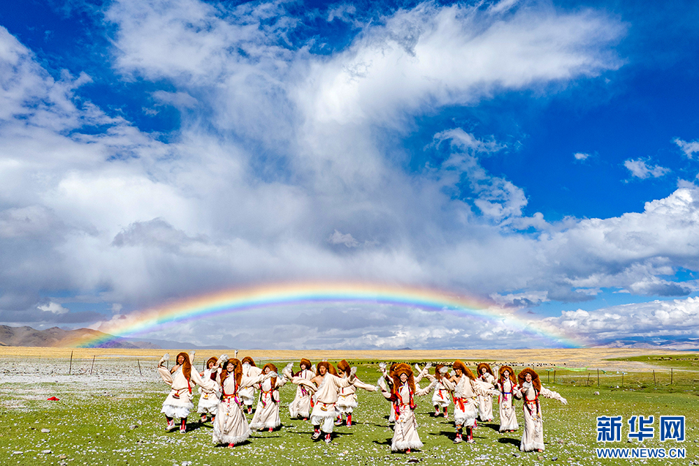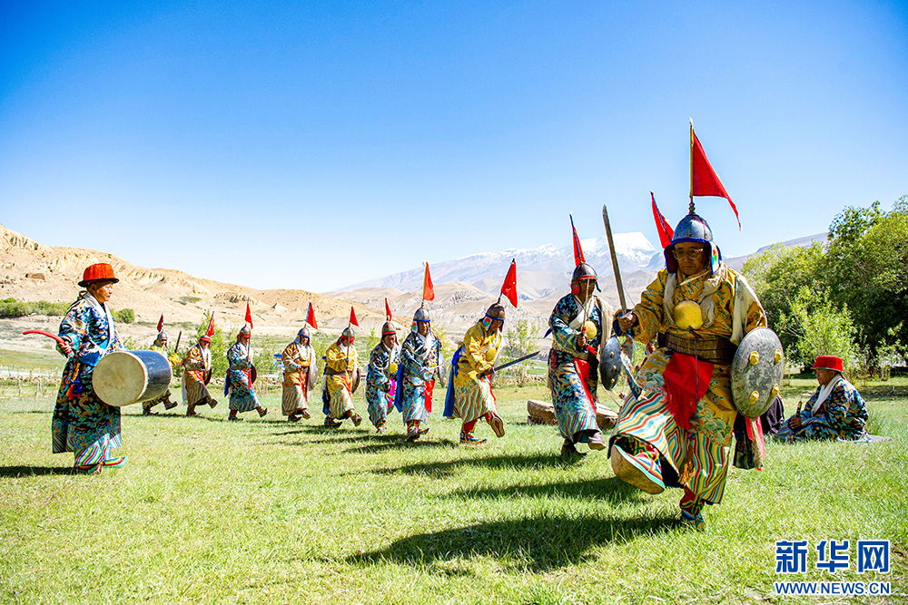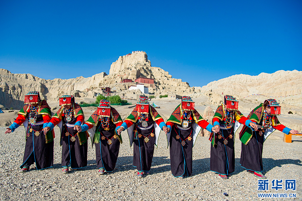 札達(dá)縣群眾在古格王國(guó)遺址腳下表演“宣舞”(6月12日攝)?!靶琛笔俏鞑匕⒗锩耖g傳統(tǒng)舞蹈,融合藏戲、舞蹈、說(shuō)唱等傳統(tǒng)民間藝術(shù),內(nèi)容涵蓋禮儀、風(fēng)俗、節(jié)慶等。2008年,被列入國(guó)家級(jí)非物質(zhì)文化遺產(chǎn)名錄。新華網(wǎng) 旦增努布 攝