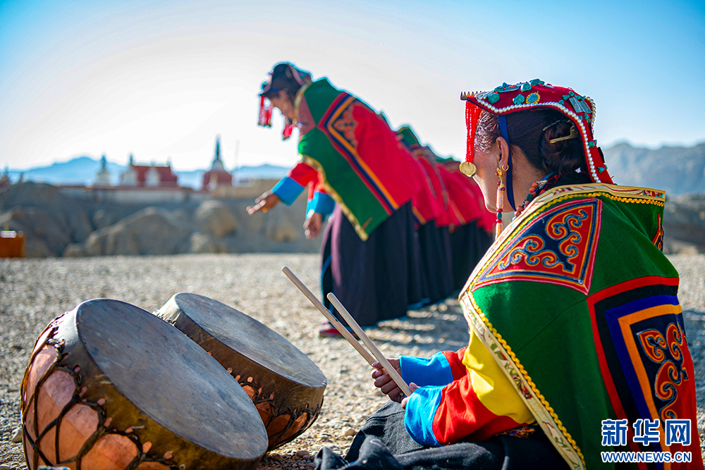 自治區(qū)級(jí)“宣舞”非遺傳承人央金(右)在古格王國(guó)遺址腳下伴奏鼓樂(lè)(6月12日攝)。新華網(wǎng) 旦增努布 攝